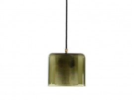 Paires de suspensions suèdoises du verrier Orrefors en verre. Constituée d'un cylindre à facettes imbriqué dans un cube en verre vert. Cordon textile. Fonctionne avec des ampoules standard E27