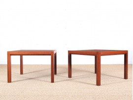 Paire de tables basses scandinaves carrées en marqueterie de bois debout de Rolf Middelboe & Gorm Lindum pour Tranekær Furniture. Le travail de Rolf Middelboe & Gorm Lindum se carractérise par des plateaux fait d'assemblage de cubes de bois de bout. Ici, ce sont 900 cubes de teck qui forment chaque plateau. Chaque table est unique et porte un numéro. Prix indiqué pour la paire.