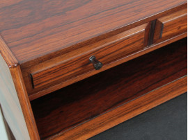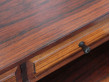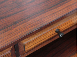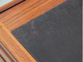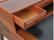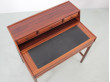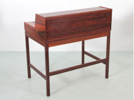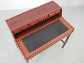 Petit bureau à gradin scandinave en palissandre de Rio. Trois petits tiroirs sur le gradin. Écritoire, gué de cuir noir, ouvrant sur deux compartiments. Très belle finition, excellent état.