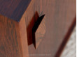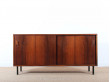 Petite enfilade scandinave en palissandre de Rio attribuée à Illum Wikkelsø pour Dammand & Rasmussen, à deux portes coulissantes ouvrant sur deux compartiments à 1 étagère chacun dont un avec tiroir à ménagère. Piètement en acier noir mat.