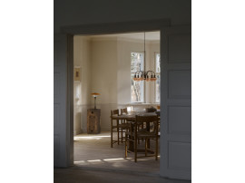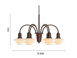 Ce lustre réédité est un design patrimonial de Poul Henningsen et, à l’instar de la lampe de table et du lampadaire, il est réalisé en laiton patiné avec de fines lignes, et équipé de petits ensembles PH 1/1 à trois abat-jour en verre opalin soufflé bouche, de couleur terre cuite poussiéreuse. Le PH 1/1 correspond au plus petit numéro du Système PH et, avec la Collection du Centenaire, marque la première réintroduction de ce numéro d’abat-jour spécifique.