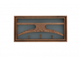 Porte-manteau scandinave mural pliant. Acajou. Fond en laminé peint en bleu. Système dépliant avec cintre et 3 patères. Lanières de cuir. Système d'accrochage par deux trous arrières.