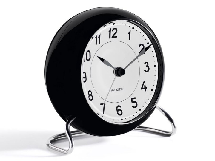 Réveil modèle Station noir/blanc. Nouvelle édition. L'élégant réveil « Station » d'Arne Jacobsen a été créé en 1939, lorsque Arne Jacobsen a conçu une maison pour le PDG de la société d'électricité Lauritz Knudsen.