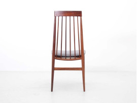 Rare suite de 6 chaises en palissandre de rio massif de Ernst Martin Dettinger. Dossier à barreaux offrant un parfait soutien du dos. Assise en simili cuir noir. Ligne d'une grande légèreté. Très beau travail d'ébénisterie.