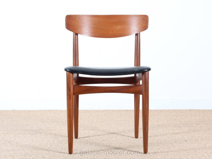 Suite de 6 chaises scandinaves en teck massif de H. W. Klein pour Bramin Møbler. Assises en simili cuir noir. Excellent confort et soutien du dos.