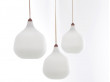 Suspension scandinave triple de Uno Christiansen pour Luxus. Potence et cache-piton en chêne. Abat-jours en verre opalisé. Fonctionne avec 3 ampoules standard. Douille E27