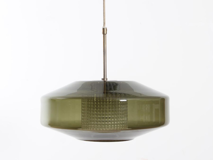 Suspension suèdoise du verrier Orrefors en verre. Constituée d'un cylindre à facettes imbriqué une sphère aplatie en verre vert. Cordon textile. Fonctionne avec des ampoules standard E27