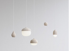 Suspension scandinave modèle Tehro. Taille L. La collection de luminaires Tehro a été conçue par la designer finlandaise Maija Puoskari. Inspiré par la nature, Tehro signifie "gland" en finnois et se réfère simplement à la forme organique des glands que l'on trouve dans les forêts. L'aspect chaleureux et la beauté du tilleul sont combinés avec de l'opaline, ce qui rend ces luminaires contemporains et intemporels. Le bois est certifié FSC par la commission européenne des forêts responsables. Le verre est soufflé à la main au Portugal. Ampoule non incluse : culot E27 , max 8W LED / Economie d'énergie