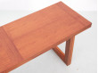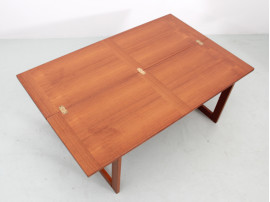 Table basse scandinave en teck dépliante de Ansager Møbler. La table s'ouvre pour donner le double de surface au plateau. De traces de perce sur le placage du plateau.