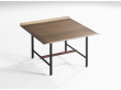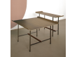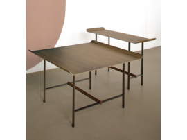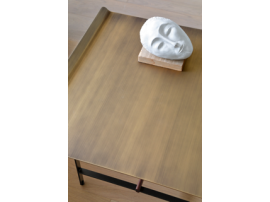 Matière | plateau en métal patiné doré. Piètement en métal laqué bronze avec traverse en noyer massif. |