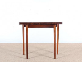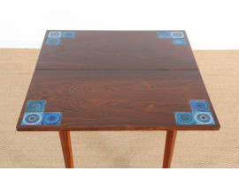 Table console scandinave en palissandre de Rio. S'ouvre en carré pour faire une table de jeux. Plateau orné de carreaux de céramique aux angles. Travail danois.