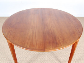 Table ronde de repas en teck de Rosengren Hansen, extensible pouvant accueillir 4 à 8 personnes. Pieds effilés en forme de T. Bandeau carré. 2 rallonges, dont l'une pliable en venant se glisser à l'intérieur de la table. Estampillée.