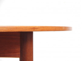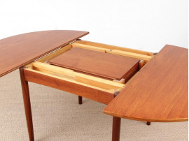 Table de repas scandinave ronde en teck à 2 rallonges pliante, rangées sous le plateau. Convient pour 4 à 10 personnes.